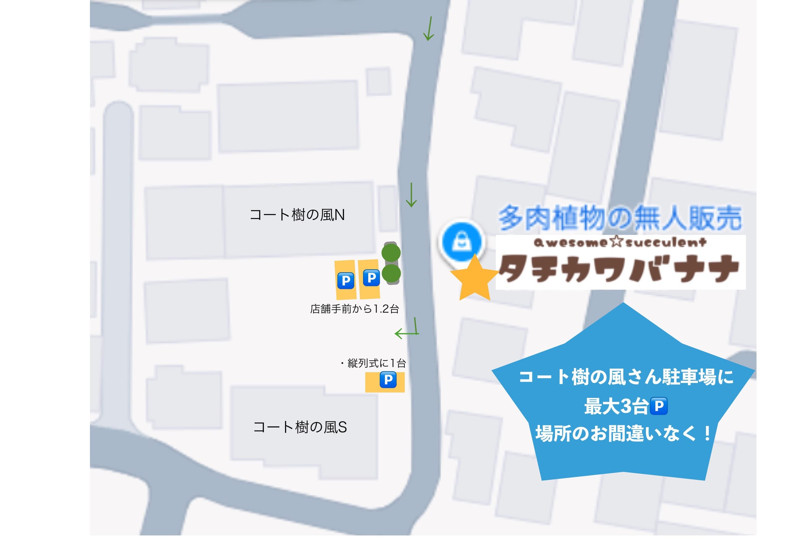 | 車で起こしの方 | 下に地図を用意しました!google Map/APPLE MAPで「タチカワバナナ」と検索いただいても出ます。どうぞ交通にお気をつけてお越しくださいませ! 近隣の住宅の敷地内には絶対に停めないでください! |
