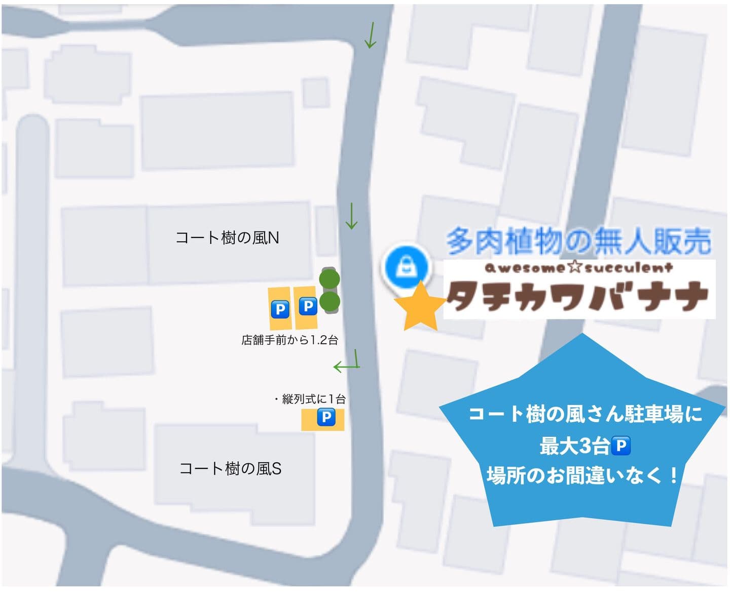 | 車で起こしの方 | 下に地図を用意しました!google Map/APPLE MAPで「タチカワバナナ」と検索いただいても出ます。どうぞ交通にお気をつけてお越しくださいませ! 近隣の住宅の敷地内には絶対に停めないでください! |